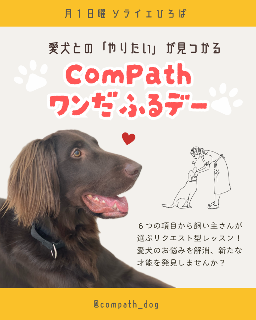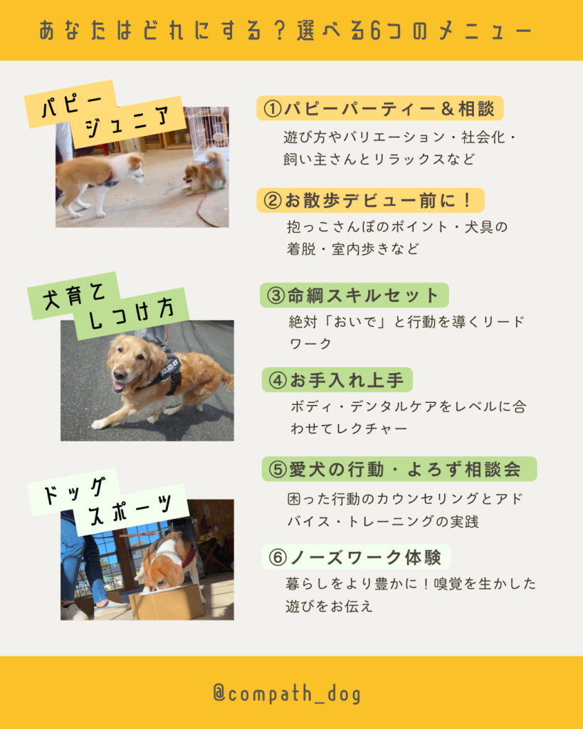 パピー教室、絶対「おいで」にお手入れ名人、ノーズワーク体験や困った行動の相談など、6つのメニューから選べるリクエスト型レッスン♪