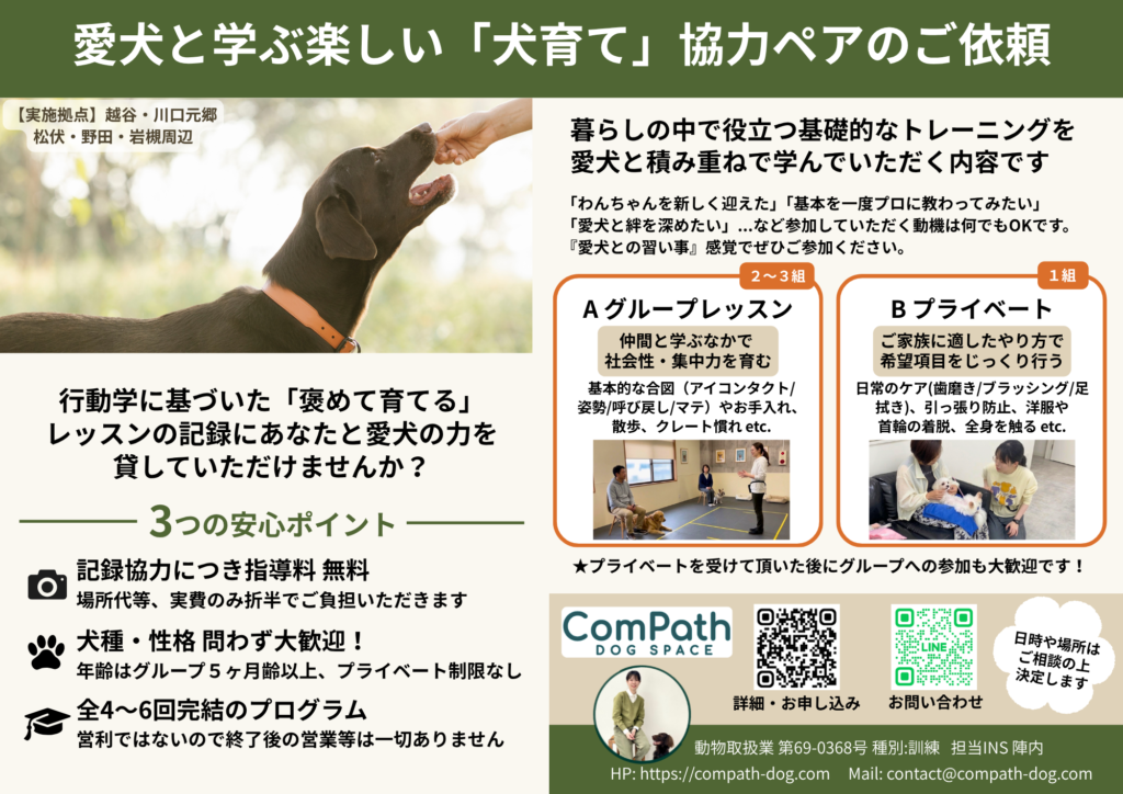 こんにちは、ComPathの陣内です。 行動学に基づいた「褒めて育てる」レッスンの映像記録に、あなたと愛犬の力を貸していただけませんか? この度、自身のスキルアップに伴い、レッスン風景の撮影にご協力いただける「愛犬&ご家族」を大募集しております。 暮らしの中で役立つ基礎的なトレーニングを、愛犬と積み重ねで学んでいただきます。 『習い事』のような感覚でぜひご参加ください。